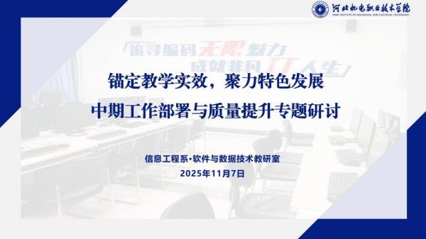 为进一步提升教学质量,强化教学过程管理,推动专业特色发展,11月7日,软件与数据技术教研室以“锚定教学实效,聚力特色发展”主题,召开中期工作部署与质量提升专题教研活动。
