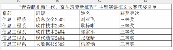 以下是“青春献礼新时代,奋斗筑梦新征程”主题演讲征文大赛获奖同学名单: