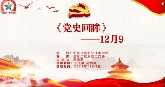 2025年12月9日,信息工程系教工党支部书记王凤著和学生党支部书记胡思啸共同指导预备党员高萌萌,推出《党史回眸—12月9日》视频党课。