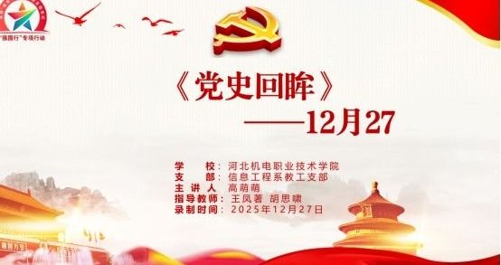 在系党总支的领导下,信息工程系教工党支部和学生党支部密切合作,协同育人,凝聚青年力量共同打造“《党史回眸》每日一讲”系列党课。2025年,12月27日,信息工程系教工党支部书记王凤著和学生党支部书记胡思啸共同指导预备党员高萌萌,推出《党史回眸—12月27日》视频党课。