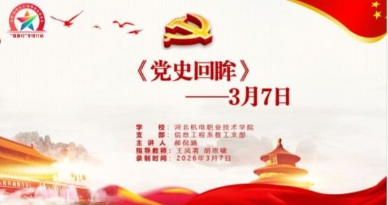 在系党总支的领导下,信息工程系教工党支部和学生党支部密切合作,协同育人,凝聚青年力量共同打造“《党史回眸》每日一讲”系列党课。2026年3月7日,信息工程系教工党支部书记王凤著和学生党支部书记胡思啸共同指导预备党员郝倪涵,推出《党史回眸—3月7日》视频党课。