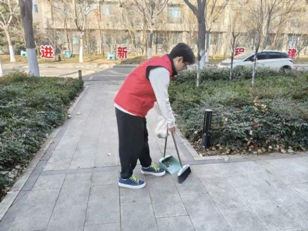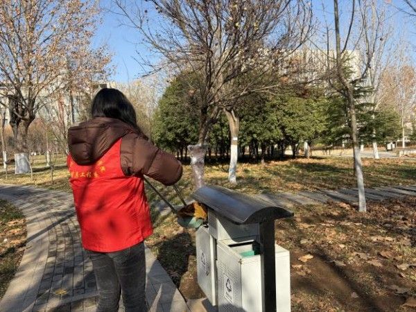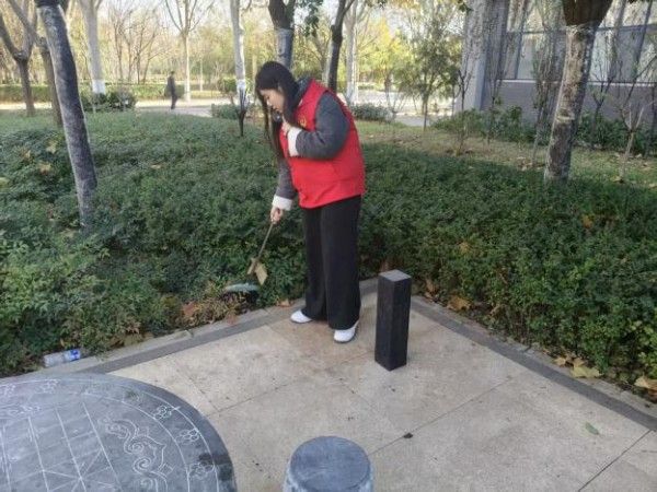 活动现场,志愿者身着志愿马甲,手持打扫工具迅速就位。大家分工有序、默契协作:有人沿步道挥帚清扫落叶,沙沙声里铺就洁净之路;有人将垃圾倒入垃圾桶。以“不怕脏、不惧细”的劲头守护每一处洁净。