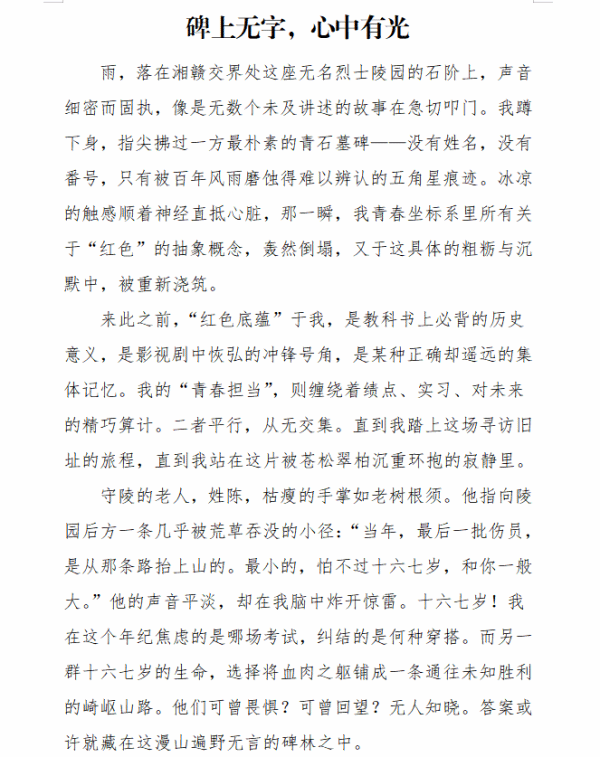 活动伊始,得到同学们的积极响应与踊跃投稿。大家以文字为窗回望红色征程,以笔墨为桥传承精神脉络。作品或追忆革命先辈抛头颅洒热血的壮阔史诗,或聚焦红色文化在校园的鲜活实践,或抒发新时代青年接力奋斗的赤忱情怀,字里行间尽显青年一代铭记历史、砥砺前行的昂扬风貌,生动诠释了红色基因在青春岁月中的赓续绵延与使命担当。