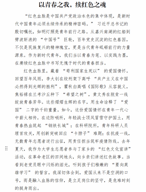 此次活动不仅搭建起感悟红色文化、抒发青春抱负的交流平台,更激发了同学们对红色共鸣与创作灵感,进一步筑牢青年一代的家国情怀与担当精神。征文活动虽已画上圆满句号,但红色精神薪火不灭,青春担当步履不停。愿同学们以红色为魂、以奋斗为翼,以初心为墨、以实干为笔,在民族复兴的壮阔画卷中,书写新时代的青春答卷,让红色血脉在代代奋进中绵延不绝、熠熠生辉!