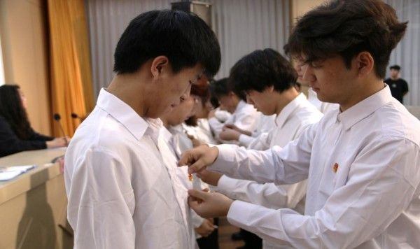 老团员代表为新团员郑重佩戴团徽,熠熠生辉的团徽既是荣誉的象征,更承载着共青团的精神传承。